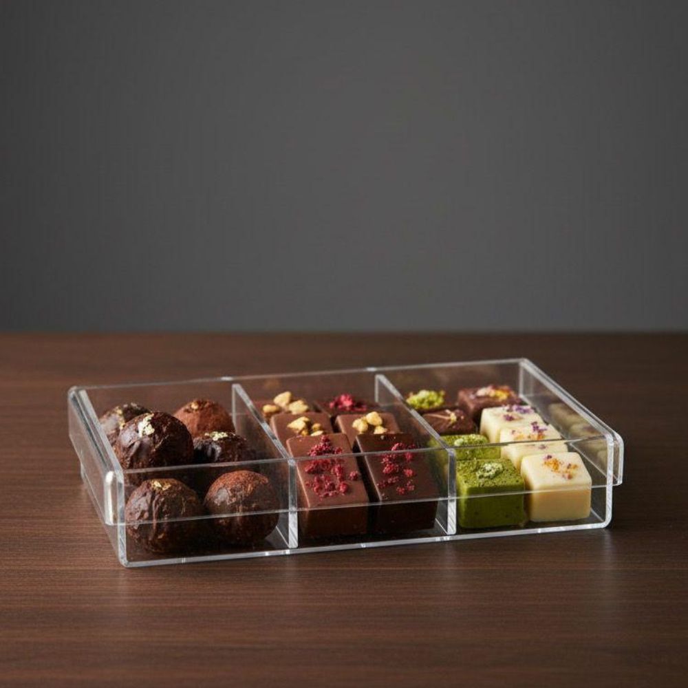 Sublimez vos créations avec notre boîte de présentation compartimentée 3 compartiment Conçue en acrylique cristallin, elle offre une visibilité parfaite à votre assortiment de chocolats (truffes, bonbons fins…). Ses compartiments distincts garantissent une organisation impeccable et protègent chaque délice. Idéale pour les cadeaux haut de gamme et les vitrines sophistiquées.