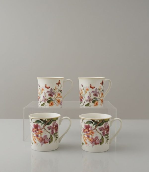 Élégant ensemble de quatre mugs en porcelaine , ornés d’un motif floral délicat rehaussé de papillons colorés. Chaque tasse se distingue par ses détails raffinés et ses couleurs harmonieuses, parfaites pour apporter une touche de fraîcheur et de nature à votre table.