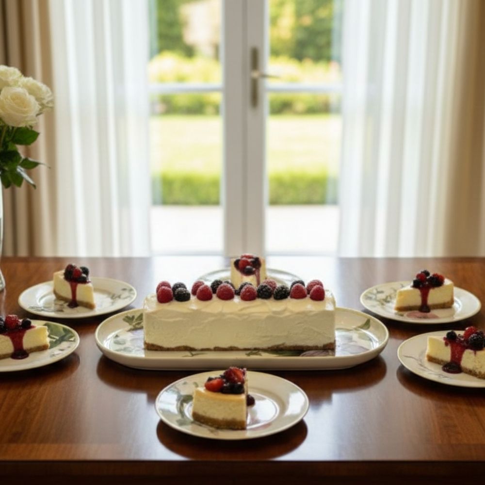 Ce service de gâteau, en porcelaine, se compose de six assiettes à dessert rondes et d’un grand plateau de service ovale