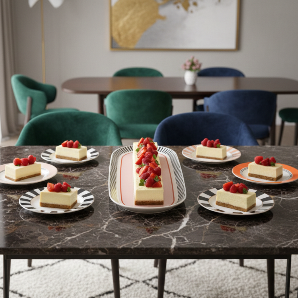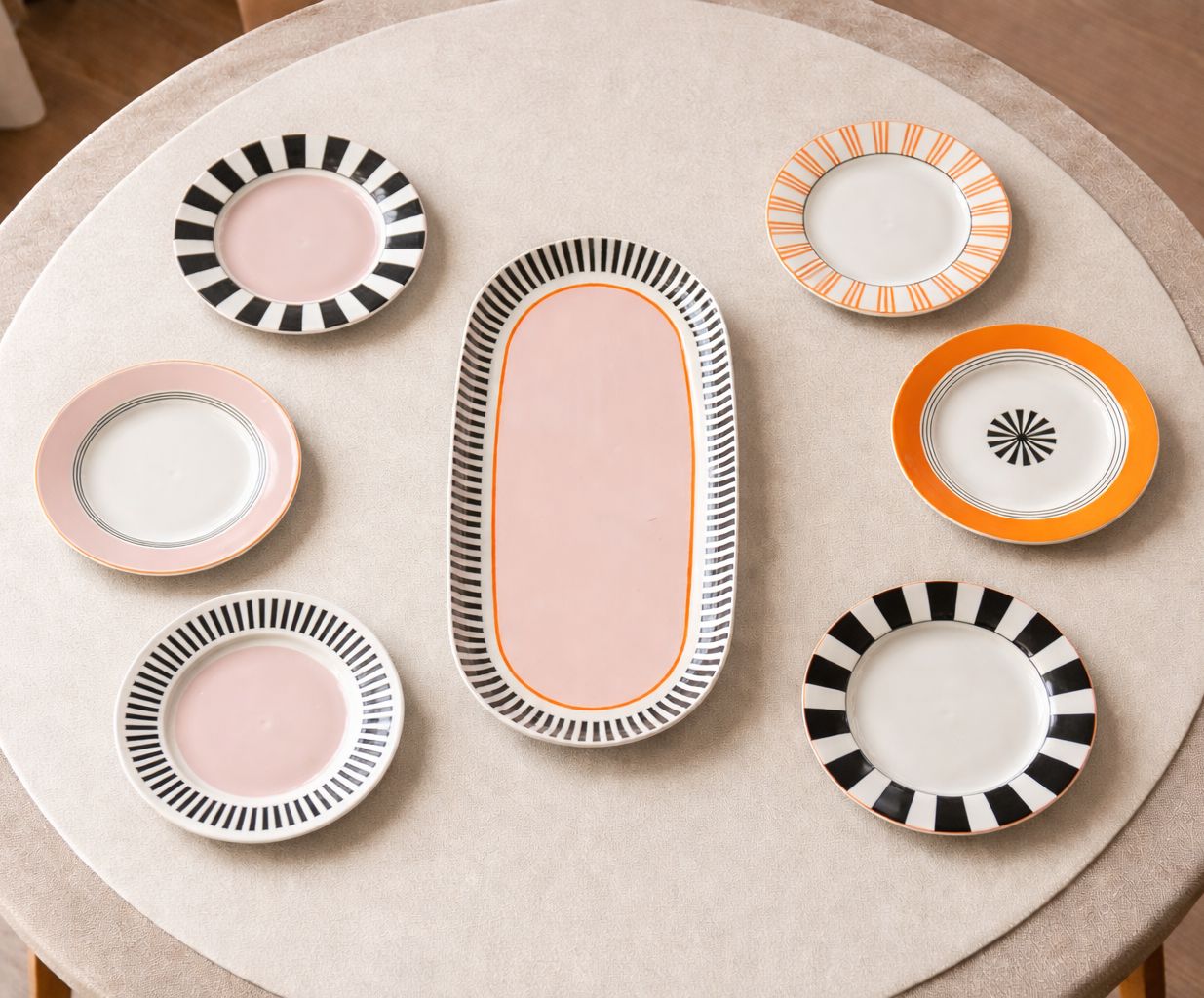 Ce service de gâteau, en porcelaine, se compose de six assiettes à dessert rondes et d’un grand plateau de service ovale