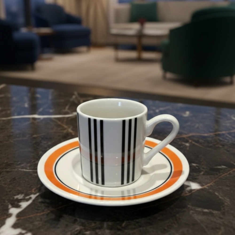 6 tasse et soucoupe fait partie Le motif vibrant et moderniste en orange, noir et blanc Un style rétro audacieux inspiré du mouvement Memphis des années 1980. Il présente des rayures verticales noires et une bande orange distinctive sur un fond blanc.