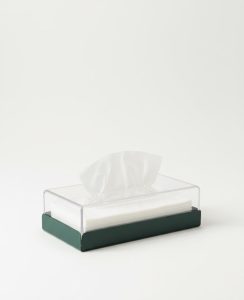 offrant stabilité et une touche de couleur sophistiquée. Le couvercle est en acrylique transparent (plexiglas), assurant une parfaite visibilité du niveau de mouchoirs.