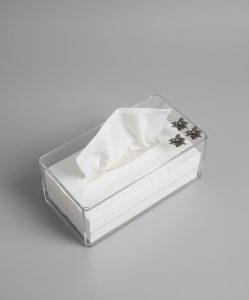 Cette irrégulière boite á mouchoir transparente, ornée de 3 bijoux choisis avec soins sur la face pour embellir vos salons et le rendre encore plus singulier et chic.