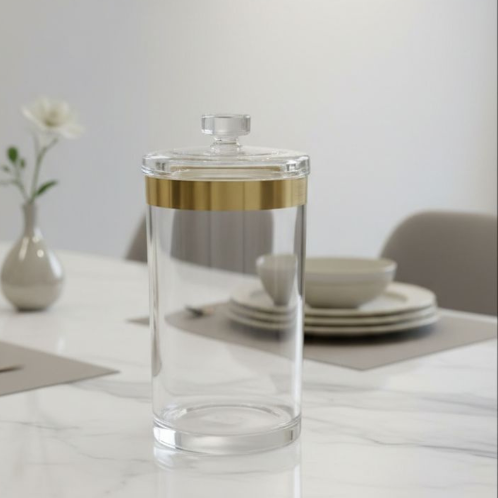 Cette boîte est une boîte hermétique en acrylique transparente avec un couvercle et une bande dorés. Elle est souvent vendue comme pot de rangement pour les salon ou comme bonbonnière