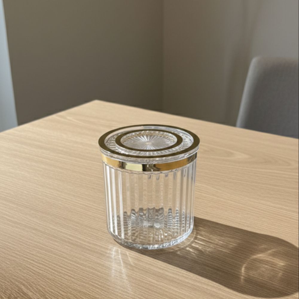 Cette boîte est une boîte hermétique en acrylique transparente avec un couvercle et une bande dorés. Elle est souvent vendue comme pot de rangement pour les salon ou comme bonbonnière