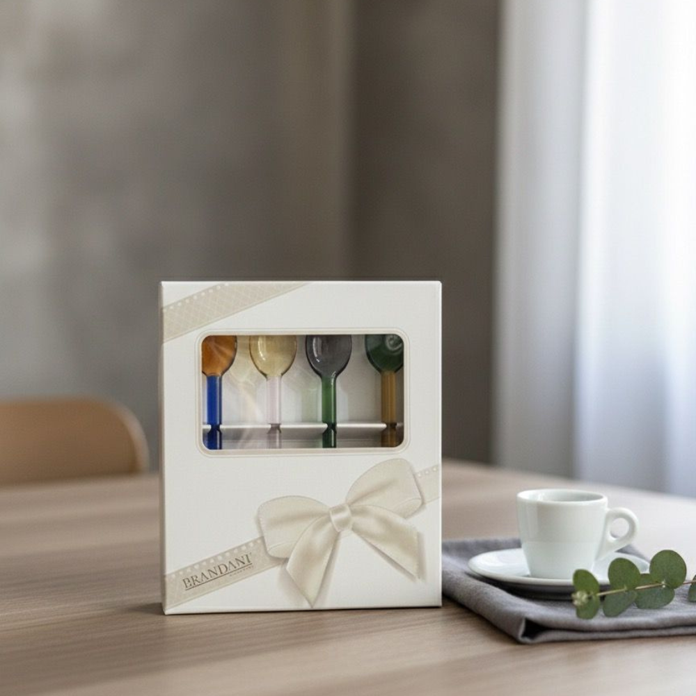 Cet article est un ensemble de cuillères en verre colorées de la marque italienne Brandani.