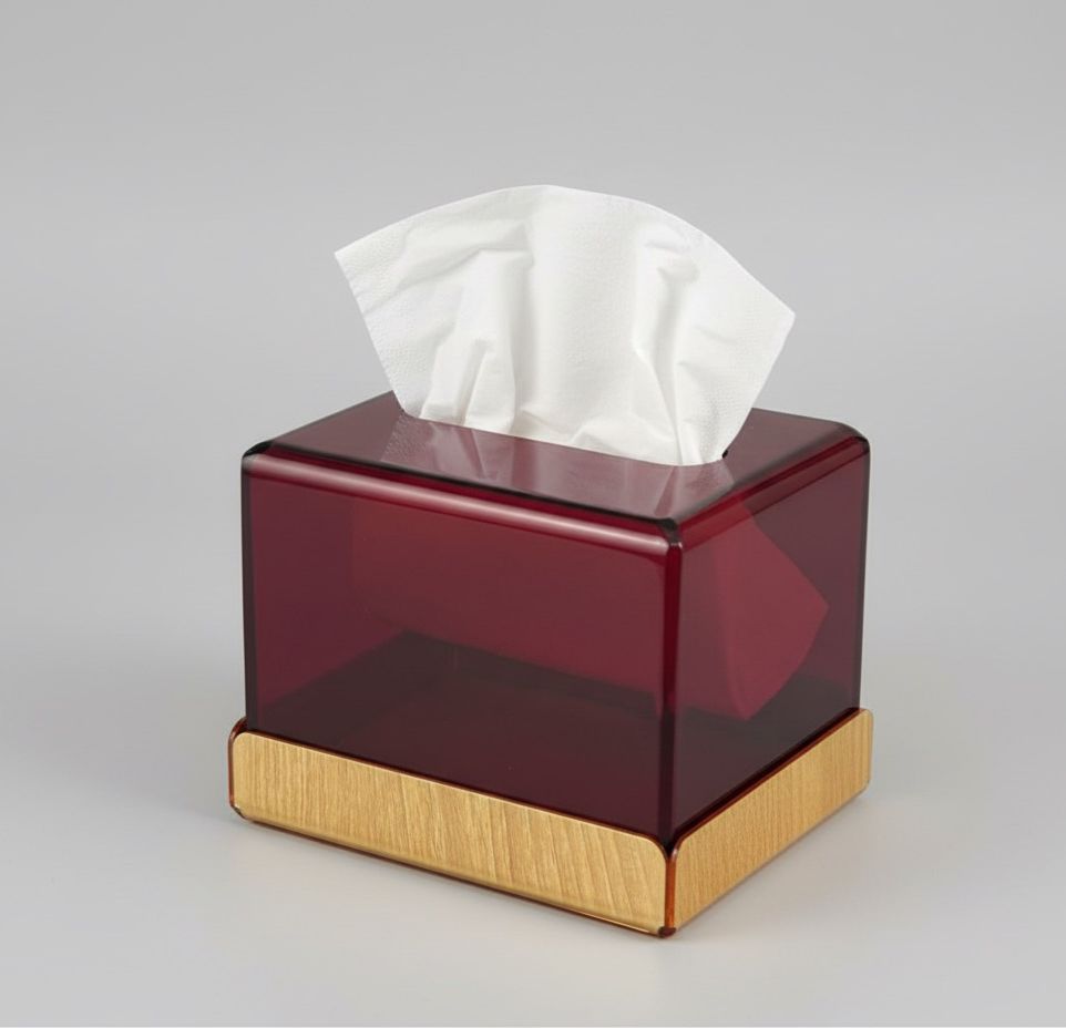 Ce style de boîte à mouchoirs, avec son acrylique rouge bordeaux translucide et sa base au fini doré , est un excellent support pour une inscription commerciale, car il dégage une impression de luxe, de sophistication et de qualité.