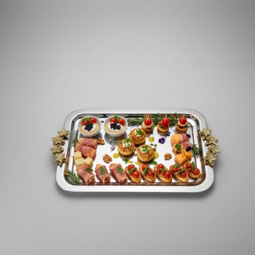 Découvrez la perfection du design avec ce plateau de service en inox conçu pour sublimer vos présentations culinaires. Sa surface brillante reflète la lumière avec raffinement, tandis que ses poignées délicatement ornées de fleurs doré ajoutent une touche artistique et sophistiquée.