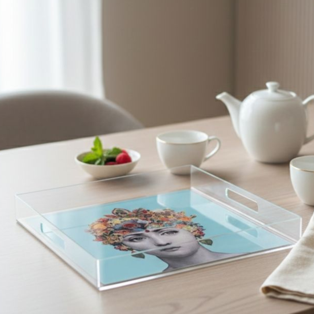 plateau de service EN PLEXIGLASS transparent orné d’un motif artistique unique d’une femme avec une coiffe florale. Le design incorpore des éléments floraux vibrants et un portrait de femme sur un fond bleu clair, offrant un mélange de style bohème et moderne