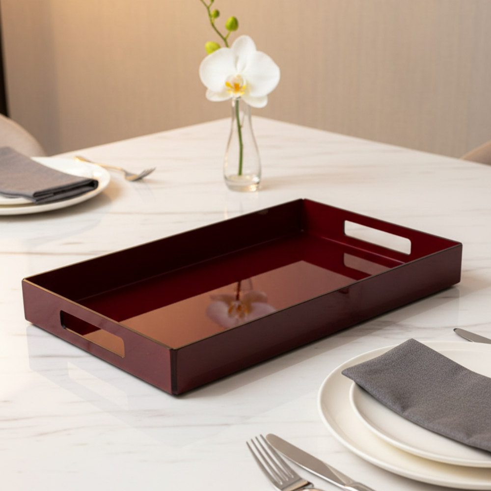 Ces plateaux sont réalisés en plexiglass qui ne jauni pas, Toujours très utile pour des présentations soignées ou bien, chez soi, pour le petit déjeuner, les terrasses, les jardins.