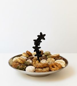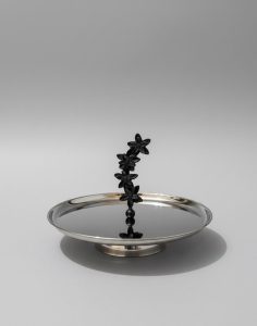 La caractéristique la plus distinctive est l’ornement central : une tige noire courbée qui supporte un arrangement de cinq éléments décoratifs noirs en forme de fleur ou d’étoile . Cette décoration est fixée au centre du plateau, ajoutant une touche d’originalité et de contraste.