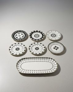 Ce service de gâteau, en porcelaine, se compose de six assiettes à dessert rondes et d’un grand plateau de service ovale